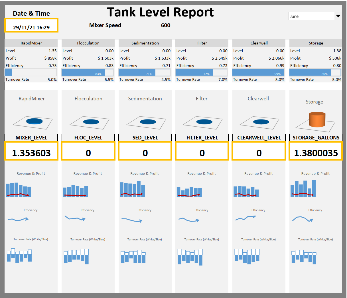 Añadiendo fórmulas y formateando las diferentes columnas, podemos conseguir tener una hoja que, tras recibir los 7 valores desde la PDB de iFIX, componga gráficos y presente unos resultados en un formato visual y atractivo.