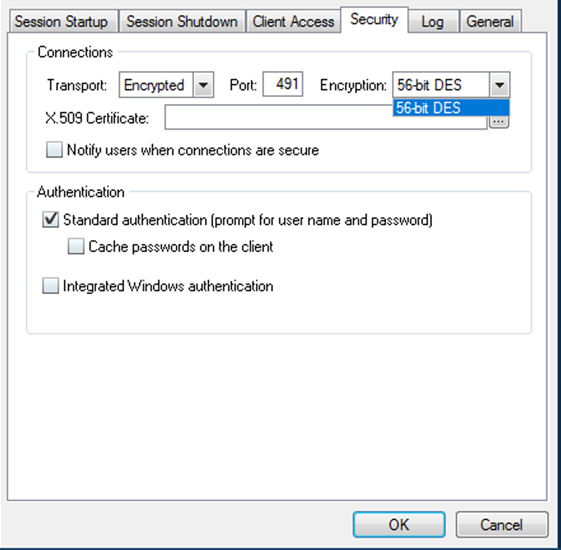 La opción "Strong Encryption" se aplica a la conexión websocket entre el navegador y el servicio APS (Application Publishing Service) de WebSpace, donde ocurre la mayor parte de la comunicación.
